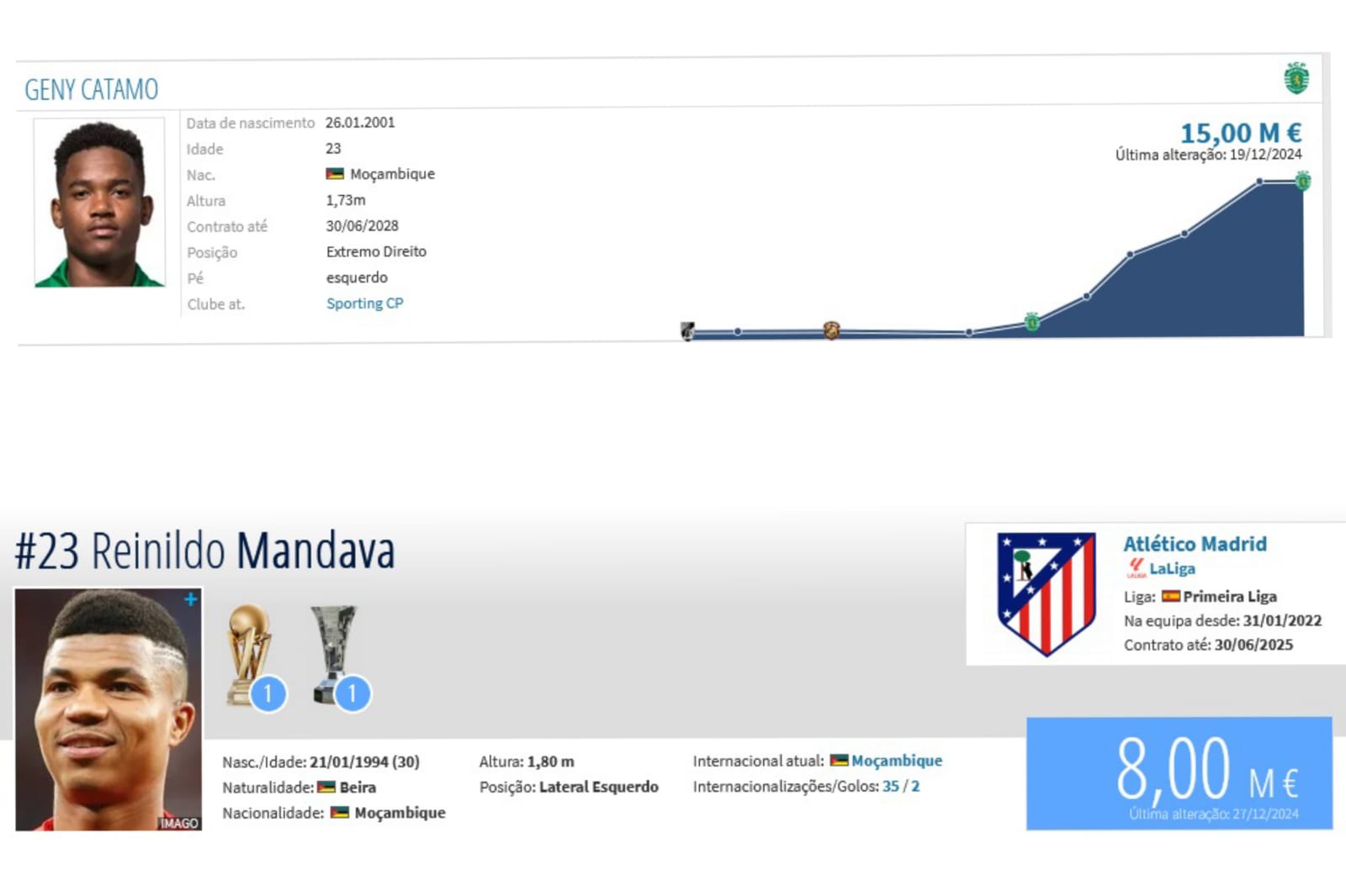 Em 2024 houve várias mexidas no gráfico publicado pelo Transfer Market, site oficial que acompanha detalhadamente o valor de mercado de todos futebolistas a nível mundial, e entre os moçambicanos houve uma alteração que salta mais à vista, que tem que ver com a subida de Geny Catamo e a queda de Reinildo para o segundo lugar. A troca de posições não causa surpresa, já que o extremo do Sporting esteve muitos furos acima do lateral do Atlético de Madrid, desempenhando um papel fulcral na sua equipa, ao contrário do seu compatriota que perdeu destaque no “xadrez” de Diego Simeone.