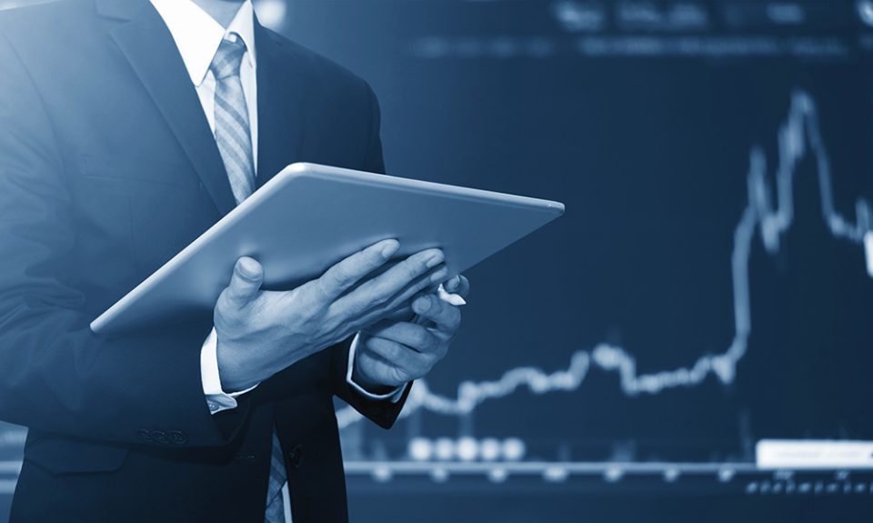 1280Closeup of two smiling young business men using tablet computer and standing with office buildings in background