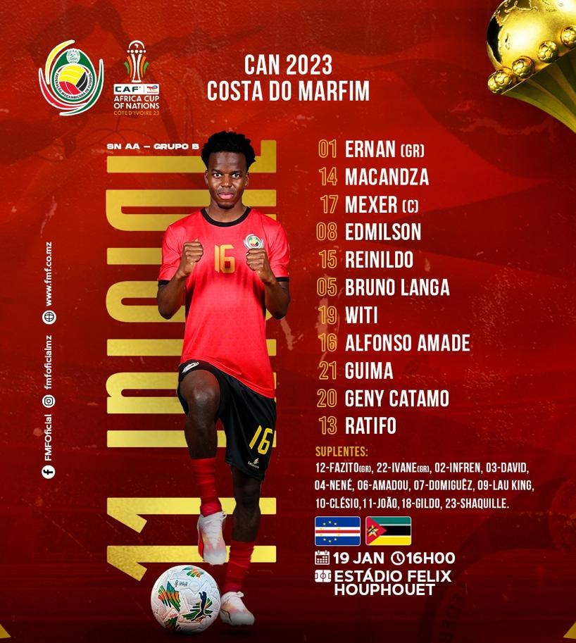 O internacionais moçambicanos Geny Catamo e Bruno Langa são as grandes novidades da equipa titular da Seleccão Nacional de Futebol que enfrenta dentro de instantes (16.00 horas) a sua congénere de Cabo Verde. O desafio é válido para segunda jornada do Grupo B do Campeonato Africano das Nações (CAN) que decorre na Costa do Marfim.